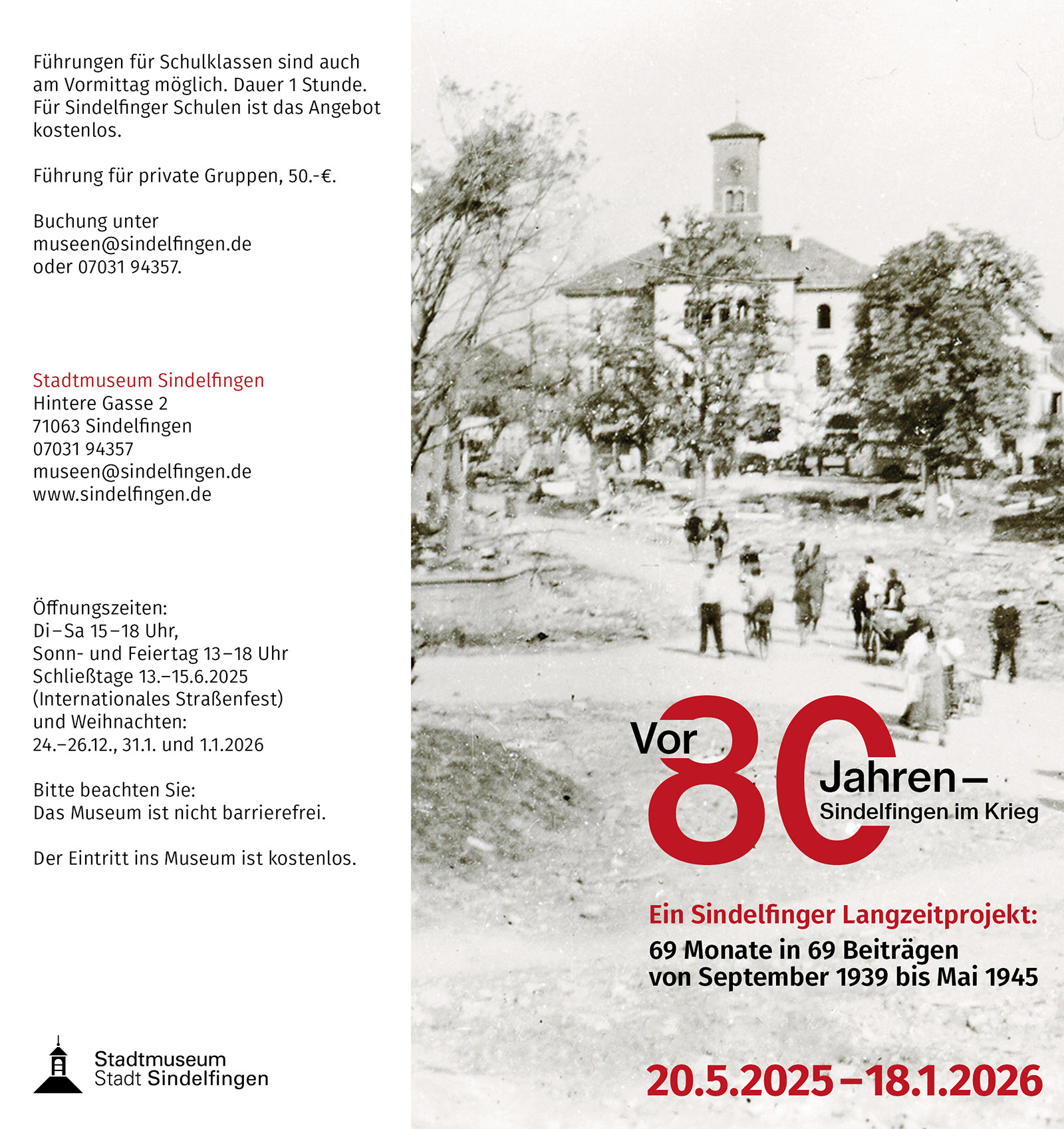 Vom 20. Mai 2025 bis zum 18. Januar 2026 präsentiert das Stadtmuseum zum Abschluss eines Langzeitprojekts die Sonderausstellung „Vor 80 Jahren – Sindelfingen im Krieg“. Zur Vernissage am 20. Mai um 17 Uhr sind alle Interessierten herzlich eingeladen.