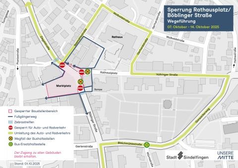 Aufgrund von Sanierungsarbeiten der Stadtwerke Sindelfingen GmbH müssen von Dienstag, dem 7. Oktober, bis Dienstag, dem 14. Oktober, die Bauzäune vor der BW-Bank, sowie dem Bekleidungsgeschäft Witt dichter an die Gebäude versetzt werde. Deshalb wird die Wegeführung am Marktplatz temporär geändert.