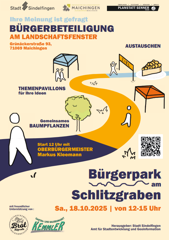 Zwischen den Quartieren Allmendäcker und Grünäcker entsteht im Rahmen des Maichinger Ortsentwicklungskonzepts ein neuer Ort für Begegnung, Erholung und Naturerleben. Alle Interessierten können im Rahmen einer Bürgerbeteiligung am Samstag, dem 18. Oktober, von 12 bis 15 Uhr am Landschaftsfenster ihre Ideen für den Bürgerpark Schlitzgraben miteinbringen und die Zukunft des Parks aktiv mitgestalten.