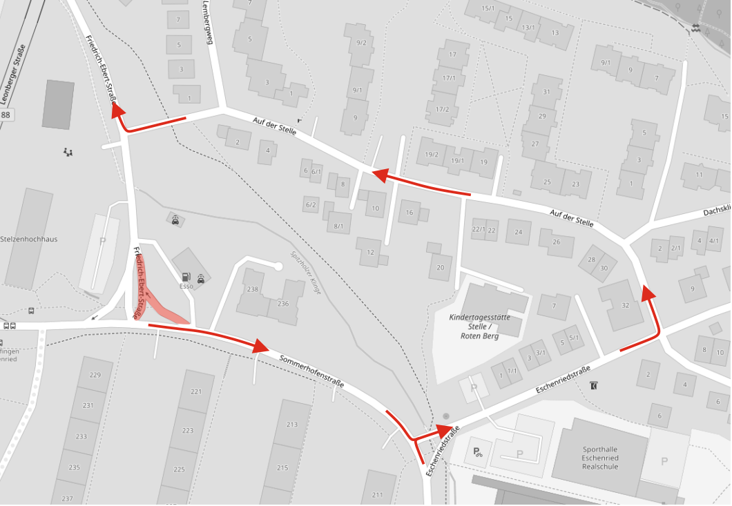 Die Leitungen werden auf dem Gehweg verlegt, die Arbeiten werden jedoch von der Straße aus ausgeführt. Aufgrund der Nähe zur Einmündung kann man während der Arbeiten von der Sommerhofenstraße nicht in die Friedrich-Ebert-Straße in Richtung Eichholz einbiegen und wird daher über die Eschenriedstraße und Auf der Stelle umgeleitet.