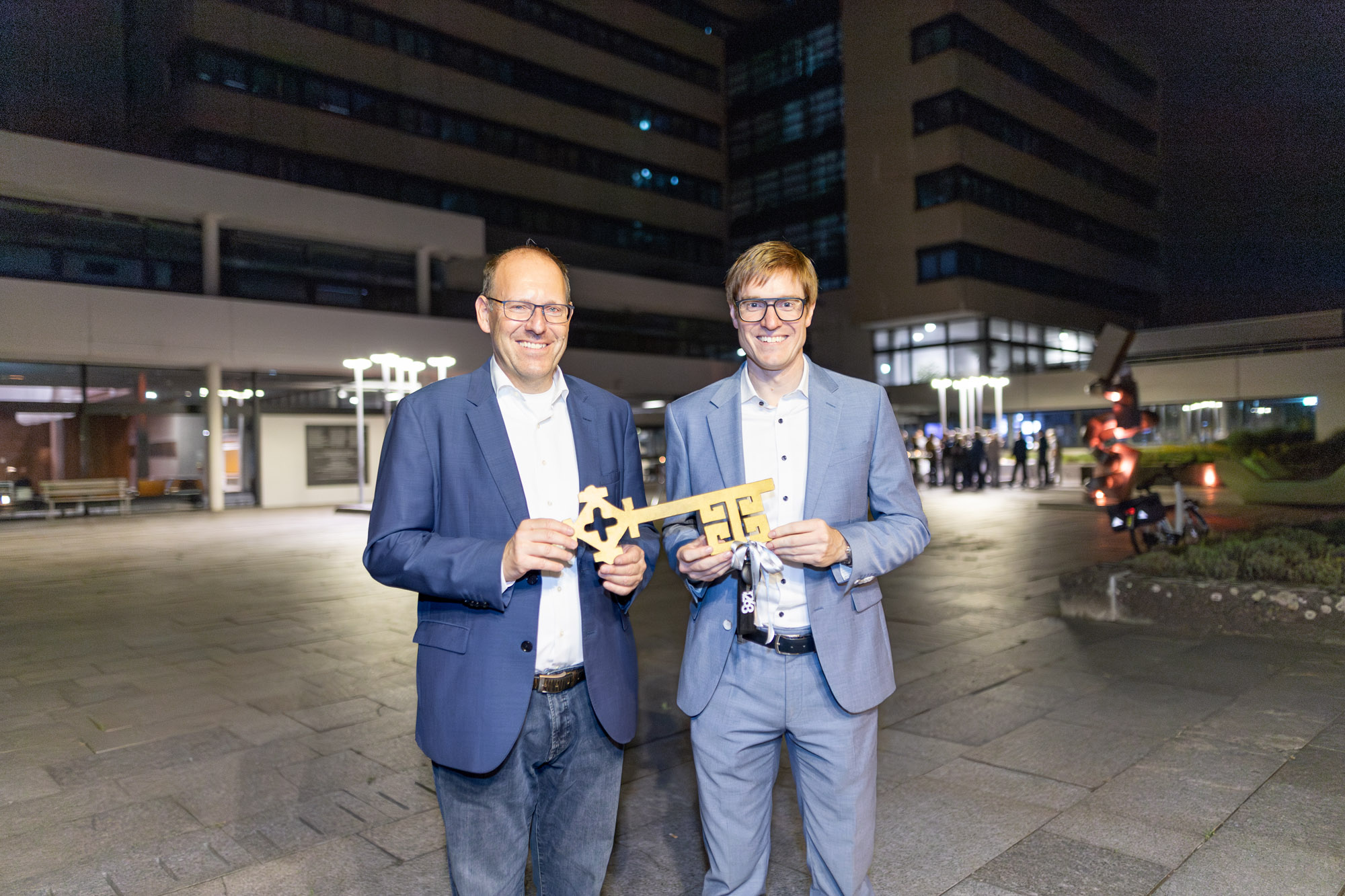 Oberbürgermeister Markus Kleemann hat am Freitag, den 1. August 2025 die Amtsgeschäfte übernommen. Oberbürgermeister a.D. Dr. Bernd Vöhringer überreichte ihm um Punkt Mitternacht in einer kleinen feierlichen Zeremonie die Schlüssel zum Rathaus.