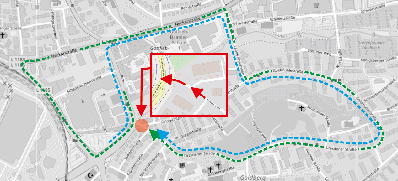 Aufgrund der Nähe der Arbeiten zum Einmündungsbereich ist ein Einbiegen von der Böblinger Straße in die Dresdener Straße während der Arbeiten nicht möglich. Entsprechende Umleitungen werden ausgeschildert.