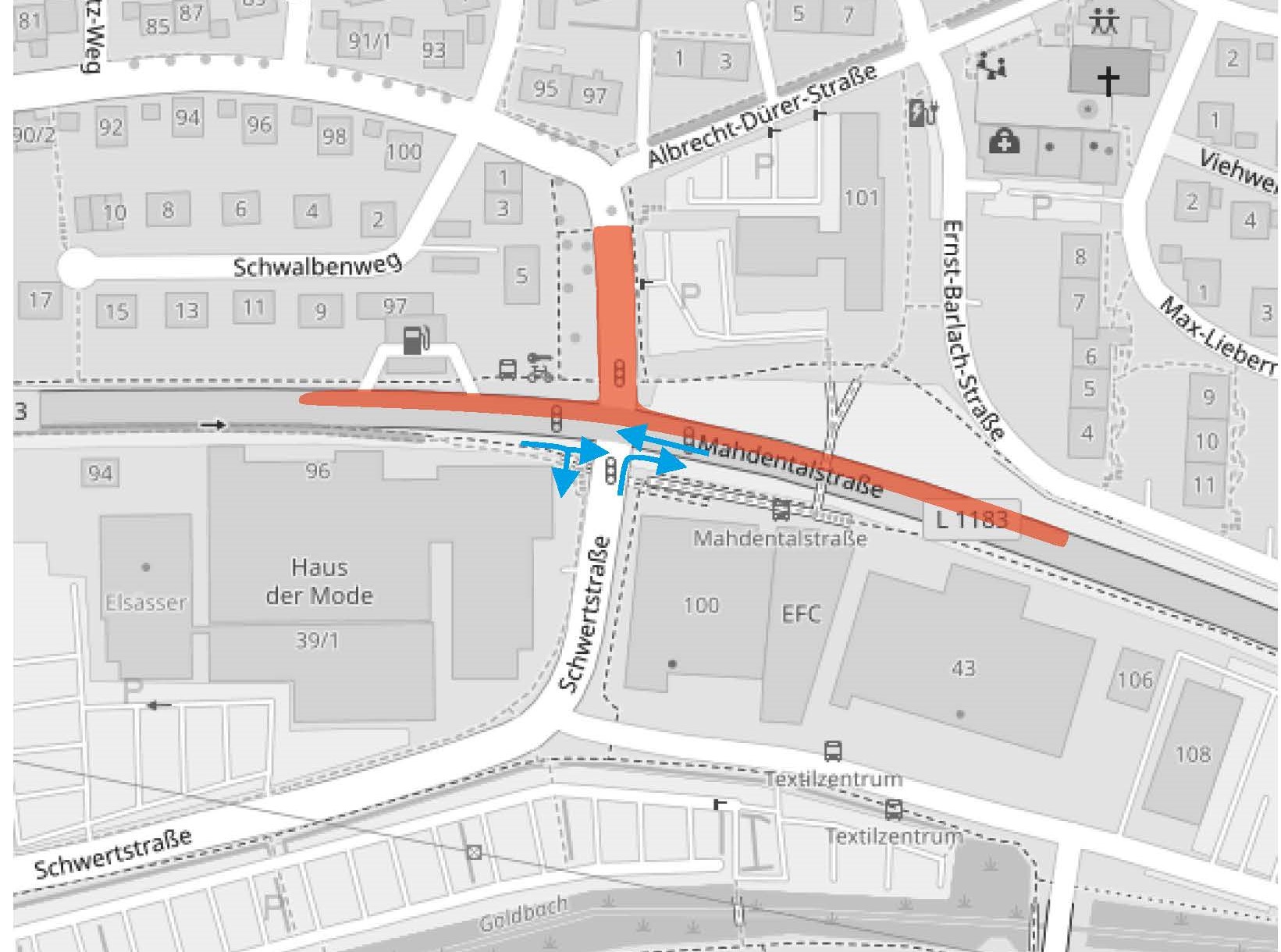 Für den Verkehr aus Richtung Innenstadt ist ein Rechtsabbiegen von der Mahdentalstraße in die Schwertstraße möglich.