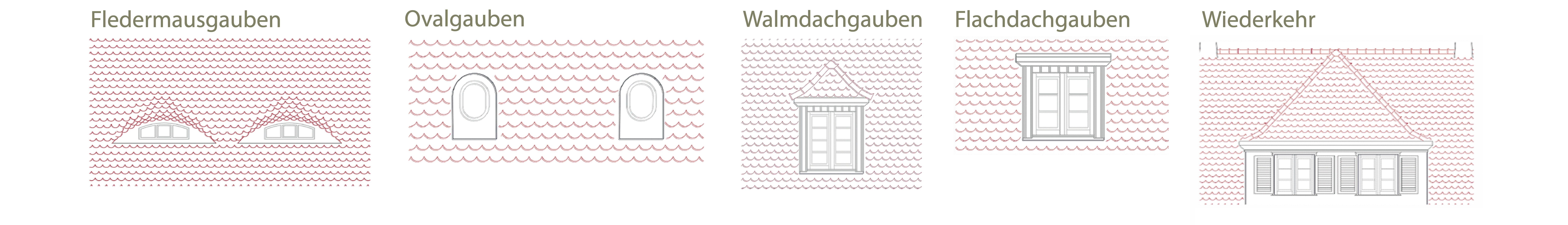 Durch die Ausbildung unterschiedlicher Bautypen als Doppel- und Reihenhäuser ergeben sich charakteristische, architektonische Details wie z.B. Walm, Schopfwalmdächer mit Rechteck-Dachhäuschen, Fledermaus-, Oval- und Rundbogengauben. Bei den Fenstern und Türen geben Profilierung und Sprossengliederung den Häusern ihre charakteristische Besonderheit.